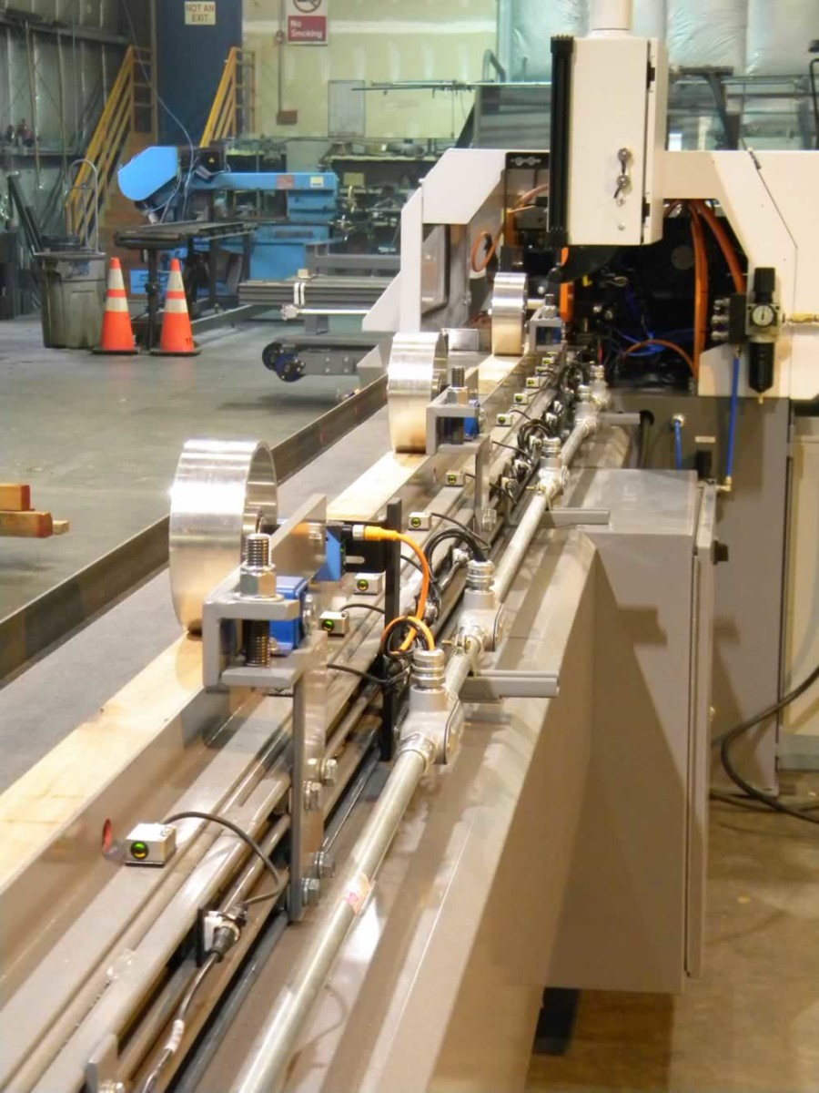 The purpose of this design is to allow for fully automatic scanning, or crayon mark reading measuring stations to be in line with a saw which has been proven to maintain higher production rates.