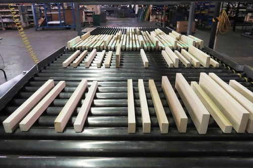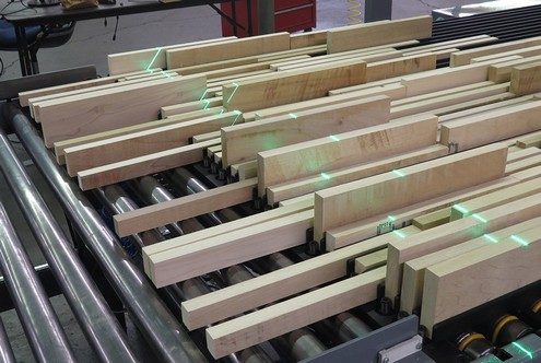 Scanning is based on line lasers at high angles being read from USB based array cameras. As many as 34 staves are measured at any time for each panel solution. Final solutions within +/- 050" up to 40" wide panels. The final stave groups are kept together and fed to a customer supplied glue wheel.
